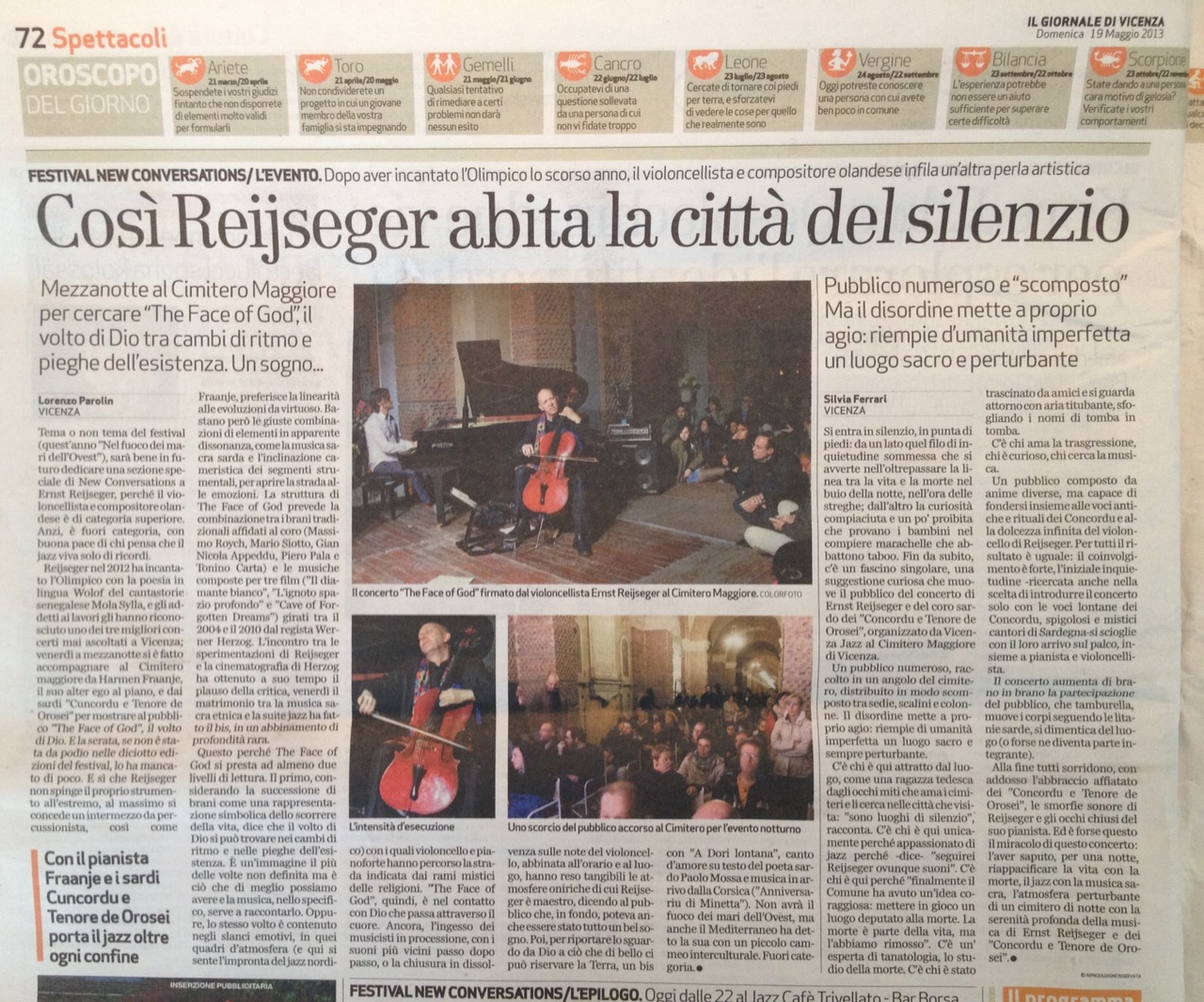 The Face of God combines songs from the sacred repertoire of the Sardinian tradition with the music that the Dutch cellist has composed as a soundtrack for some films directed by Werner Herzog: cinematographic works to say the least visionary about which Reijseger’s music lies like a magic veil, helping to create a hypnotic effect out of time. On the one hand, the virtuosity of Reijseger, which surprises for the somewhat transgressive technique and the ability to transform even sound experimentation into poetry, on the other the harmonious mottling of the Sardinian traditional song of the Cuncordu and Tenore de Orosei: the expressive contrasts between jazz d avant-garde and sacred music of ethnic origin promise to unleash an arcane and perturbing charm.